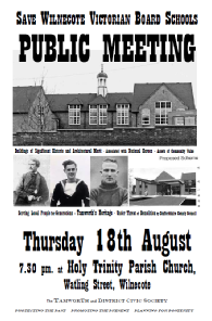 A Public Meeting called by TDCS to update the community on our research and campaign to save the former Wilnecote Board Schools from demolition by Staffordshire County Council was held in Wilnecote Parish Church on 18th August 2016. TDCS explained that we are pressing Tamworth Borough Council to use its powers to protect the historic buildings through immediate inclusion in the Wilnecote Conservation Area and Local Listing, and we launched a Petition in support of that action.