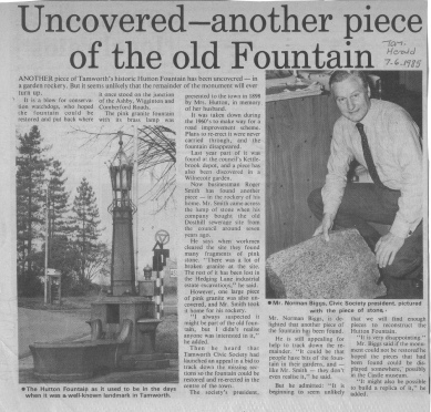 Civic Society appeal in the Tamworth Herald in 1985 for the return of the Hutton Fountain remains.